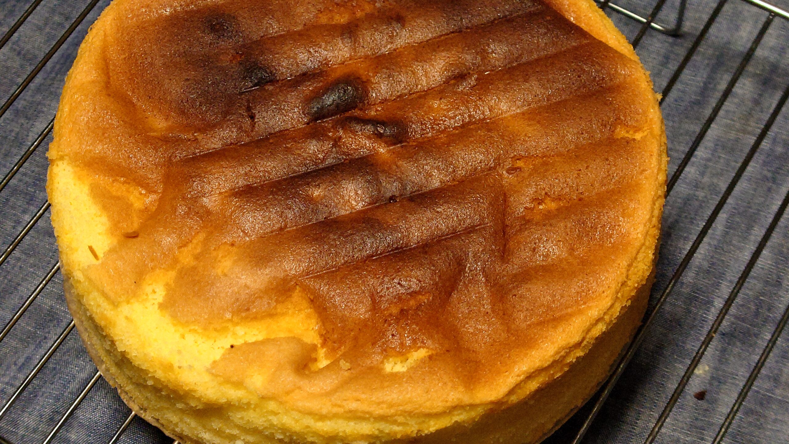- 焼き上がったら型を20cm落として空気抜きをして、型にから取りだしてオーブンペーパーをつけたまま冷やす